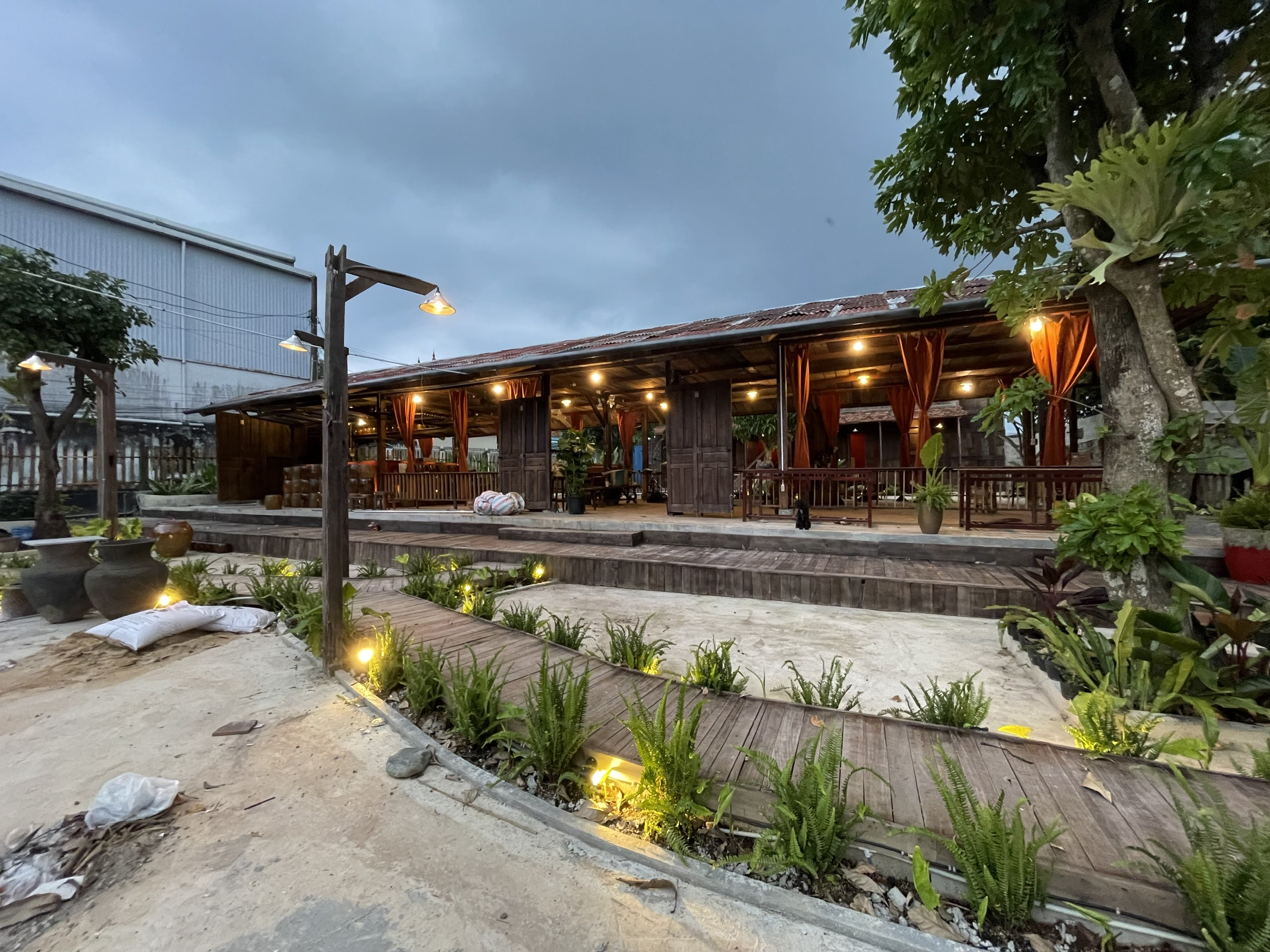 Sân vườn của quán được thiết kế để tạo ra một không gian thư giãn giữa thiên nhiên, với những lối đi rải sỏi và khu vực ngồi được bố trí khéo léo dưới những tán cây xanh. Đặc biệt, ánh sáng đèn ấm áp được sử dụng để làm nổi bật không gian vào buổi tối, tạo ra một bầu không khí ấm cúng và dễ chịu, giúp khách hàng cảm nhận được sự thư thái.