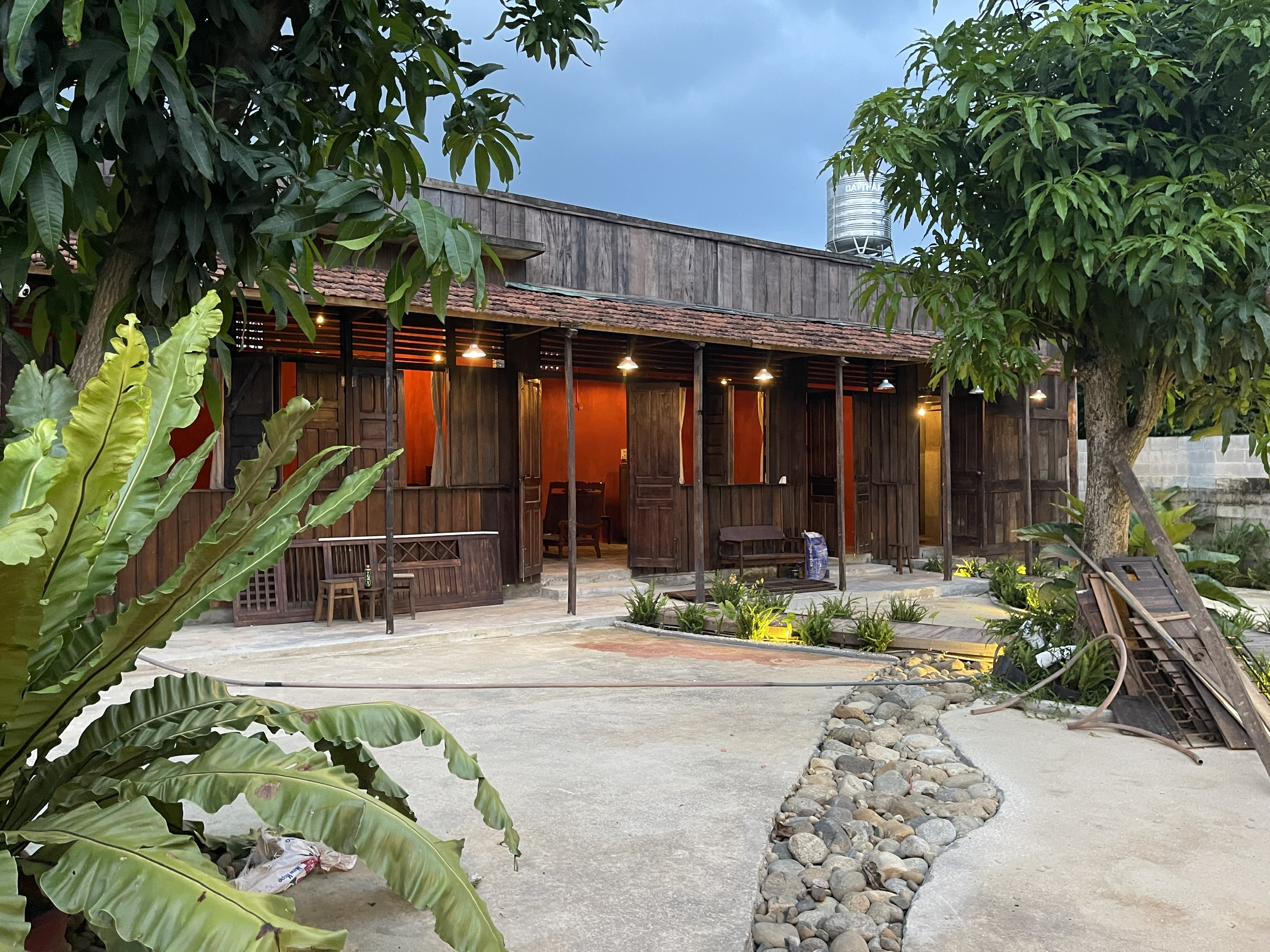 Để hoàn thiện không gian, chúng tôi đã bố trí đèn ấm áp trong khu vực sân vườn, tạo ra một bầu không khí dễ chịu và lãng mạn vào buổi tối. Sân vườn được thiết kế với những lối đi rải sỏi và khu vực ngồi được bố trí dưới tán cây xanh, mang lại sự thư giãn và cảm giác thoải mái.