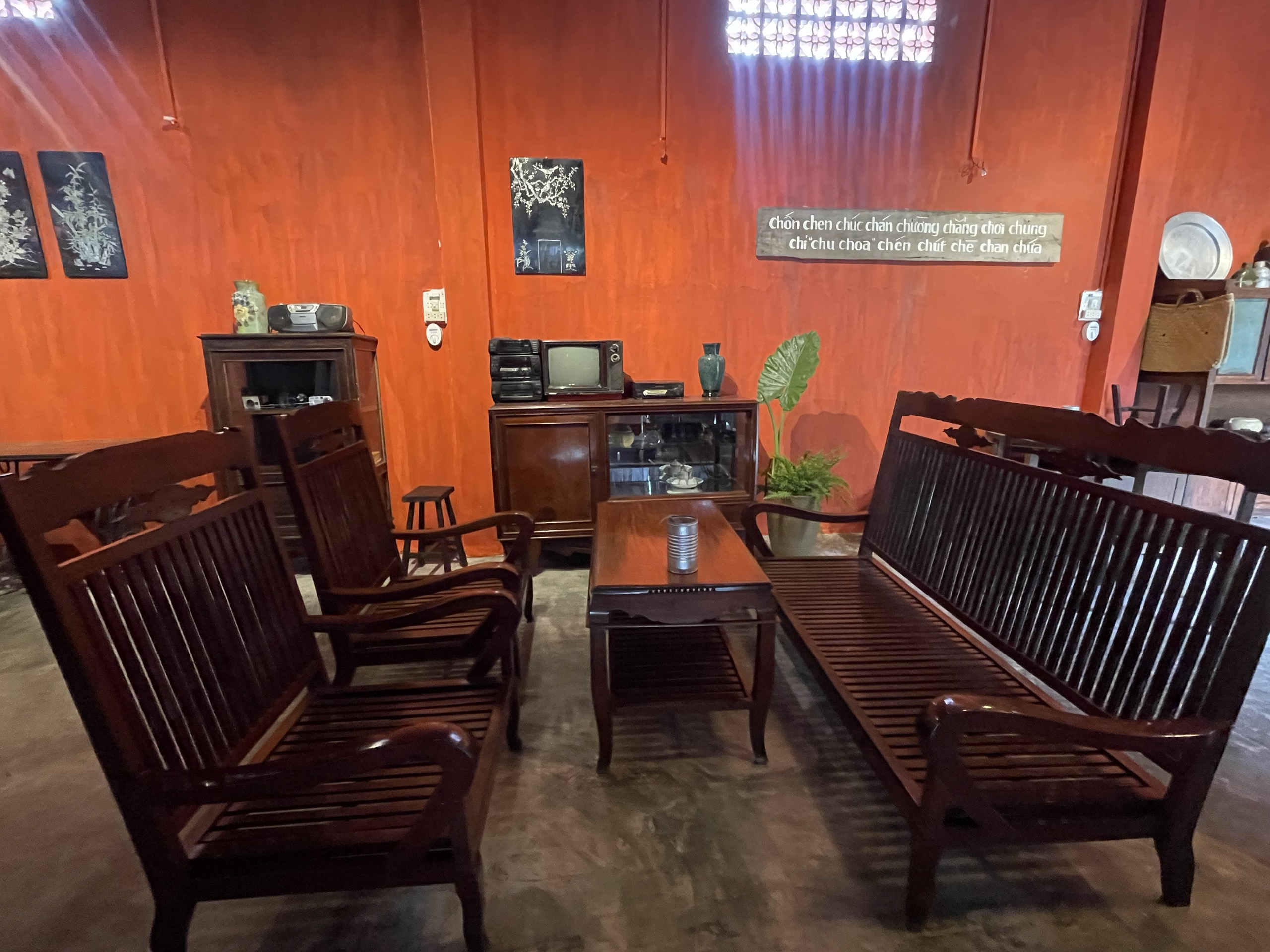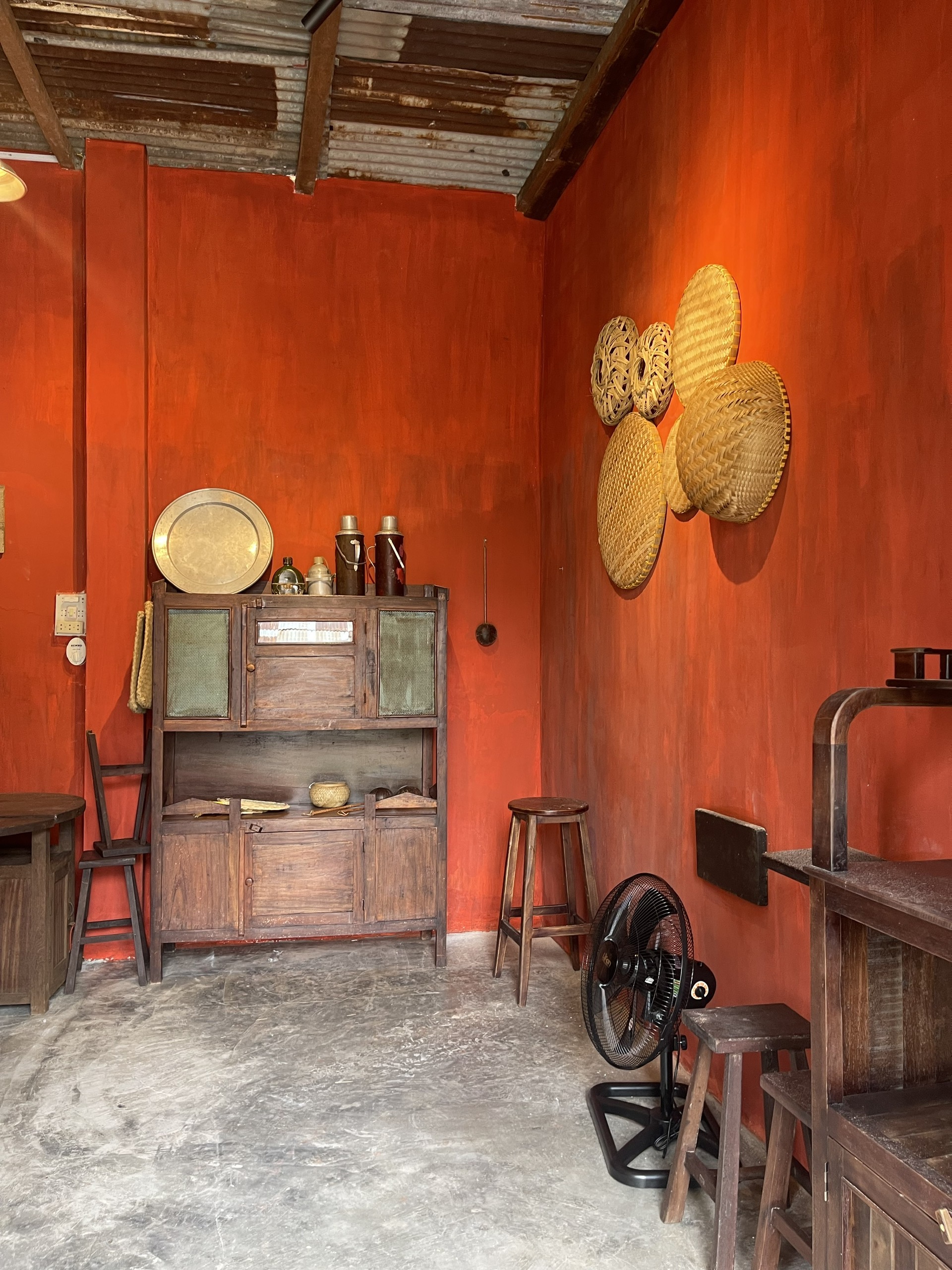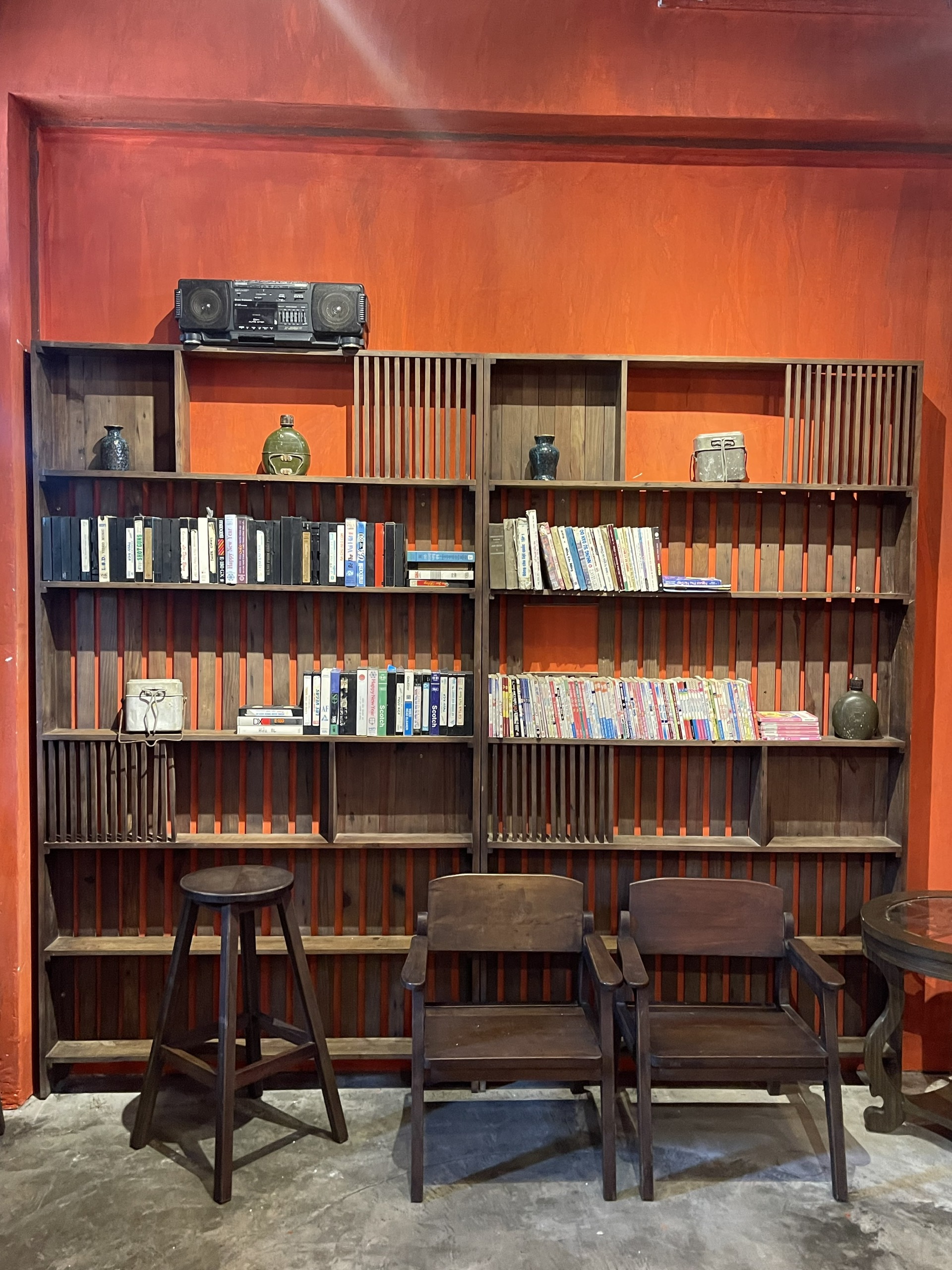 Không gian quán được trang trí bằng tường đỏ truyền thống, gợi nhớ đến những ngôi nhà xưa cũ với vẻ đẹp giản dị và ấm áp. Tường đỏ không chỉ tạo ra một bức nền nổi bật mà còn mang đến cảm giác gần gũi và đầy kỷ niệm. Sàn xi măng được sử dụng để tăng cường sự bền bỉ và giản dị của không gian, đồng thời dễ dàng kết hợp với các món đồ nội thất và trang trí cổ điển.